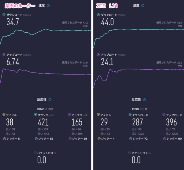 パケットロスも数回テストした分にはWiMAXより少ない印象。