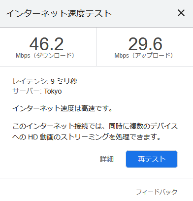 同日テストのfast.comとgoogleも。googleは「速度テスト」と検索すれば検索画面からテストできる。